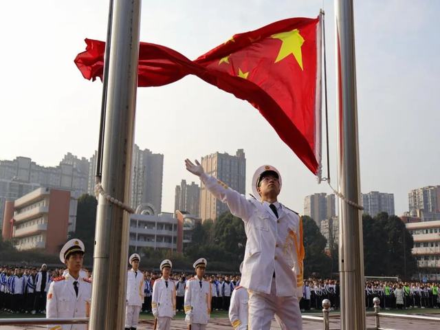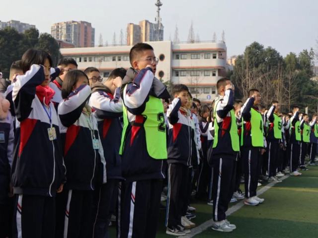 2025年2月17日9:30,四川省大邑中学2025年春季开学典礼开学典礼暨“追光逐梦· 持恒致远”主题教育活动在庄严的升旗仪式中拉开帷幕。国旗班迈着整齐的步伐,护送国旗至旗杆下。随着雄壮的国歌声响起,五星红旗冉冉升起,全体师生肃立注目,心中激荡着对祖国的热爱与对未来的憧憬。