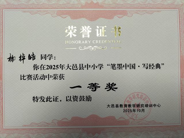 我校学生杨梓皓在2025年大邑县中小学“笔墨中国·写经典”比赛活动中荣获一等奖
