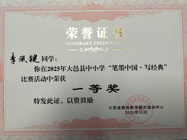 我校学生李泯键在2025年大邑县中小学“笔墨中国·写经典”比赛活动中荣获一等奖