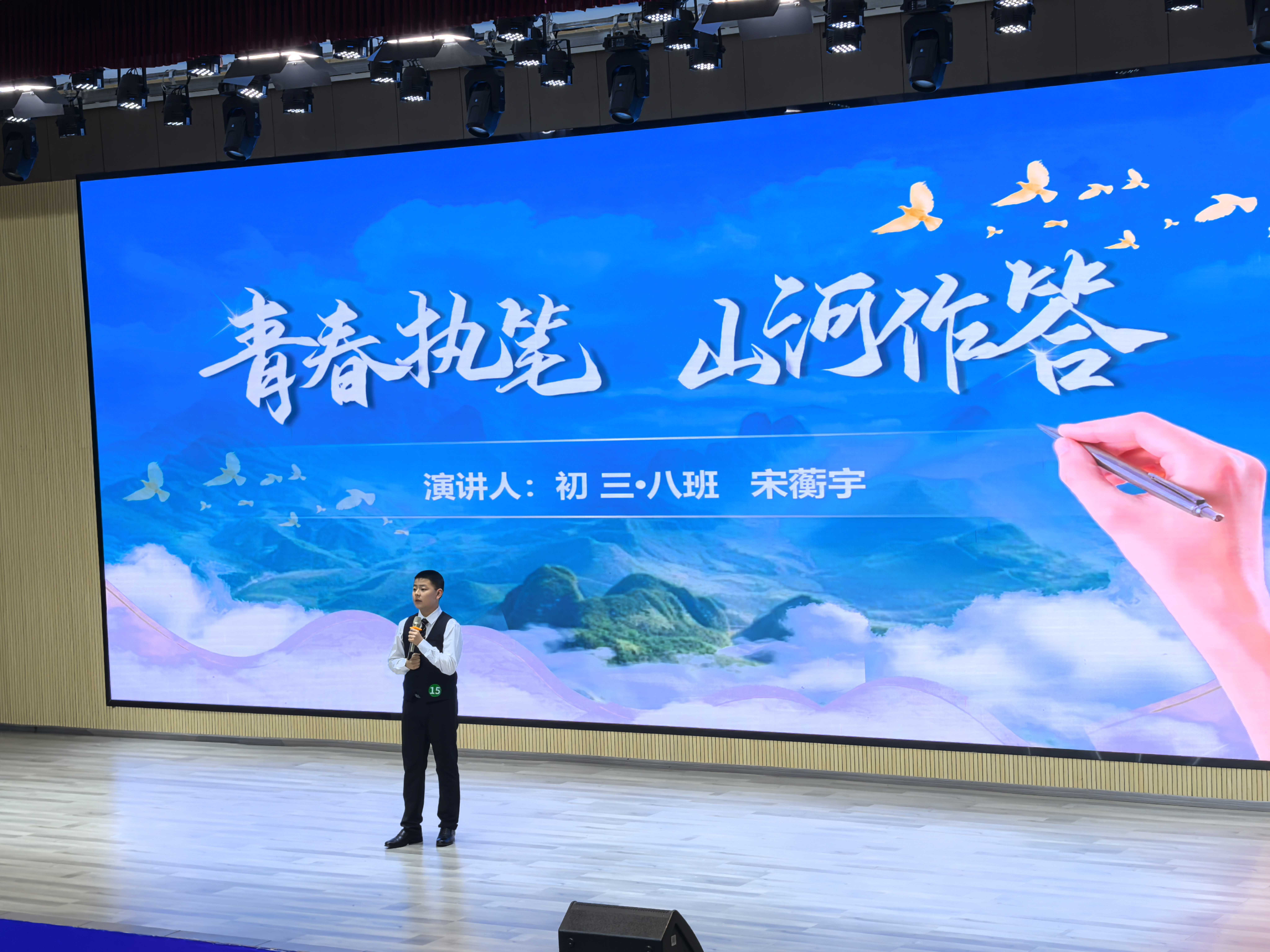 “我们这一代人要交出怎样的答卷?是沉迷虚拟世界的苍白答案,还是扎根显示砥砺前行的坚定答案?”来自初三8班的宋蘅宇同学以《青春执笔,山河作答》为题,发出号召:让我们以汗水为墨,实干为笔,在万里山河间写下我们这一代人的青春答案!