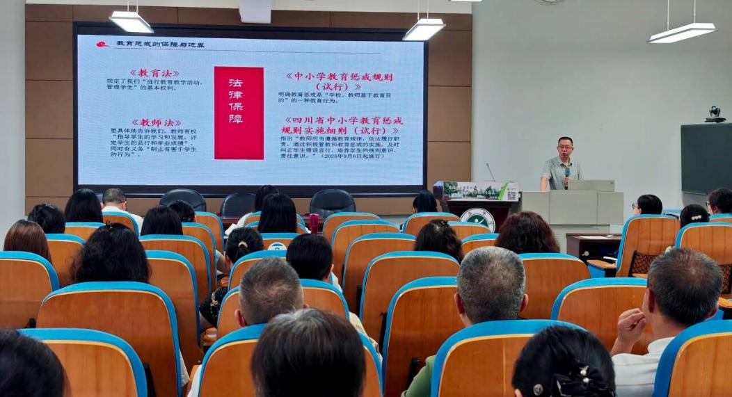 会议特邀四川藏锋律师事务所律师付洪祥围绕《四川省中小学教育惩戒规则实施细则(试行)》作题为《学生惩戒规则与教师法律风险防范》的专题讲座。付律师结合当前教育实际,明确了实施教育惩戒的合法保障与边界。他通过详实的案例,重点讲解了教育惩戒权如何正确、规范运用。讲座内容直面焦点问题,为教师们依法从教、科学施教提供了清晰的法律遵循和操作指引。