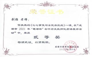 2022-04-13——大邑中学教师优质课展评获佳绩热烈祝贺我校刘颖老师在成都市教育科学研究院举行的“成都市2021年‘蜀都杯’初中历史教师优质课展评活动”中荣获二等奖,杨敏老师、江明老师荣获优秀指导教师奖。刘老师此次取得佳绩,源于个人的努力,也有团队的倾囊相助。赛前,大邑中学历史教研组老师们各尽其能,给出一系列细致且...阅读 - 30 2022.03